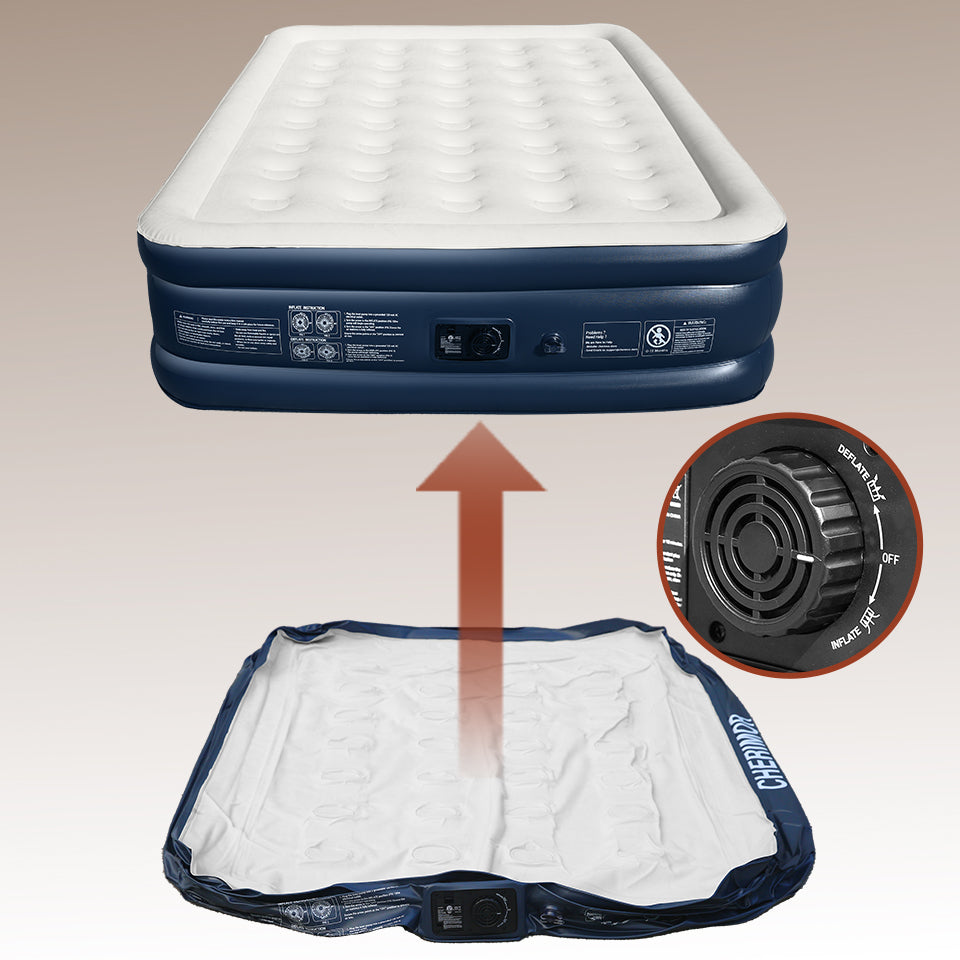 Say goodbye to manual inflation! Our one-touch button facilitates effortless inflation and deflation. The air mattress features a built-in high-volume pump that quickly inflates the mattress to your desired firmness in just around 2-3 minutes.