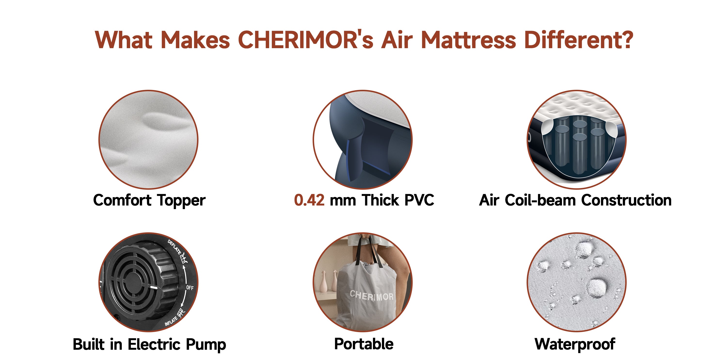 The air coil beam construction evenly distributes weight, providing ample full-body support for an excellent night's rest. Sleeping on the CHERIMOR Air Mattress feels like resting on a giant soft pillow.