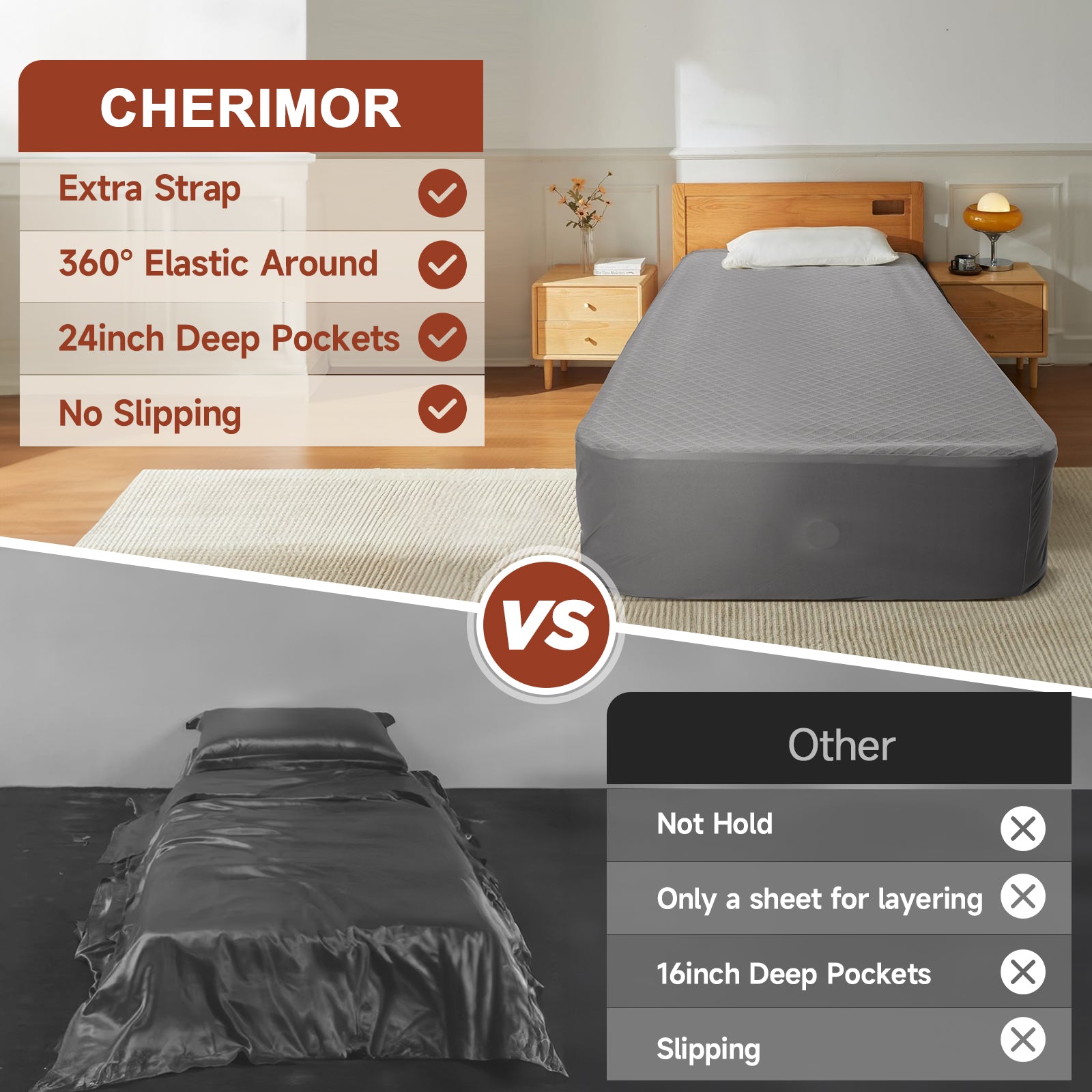 - Anti-Slip Design for Maximum Stability: Our fitted sheet features a thoughtful 360-degree all-around elastic edge that ensures it stays snugly in place, even on thick mattresses. Additionally, we’ve included an extra adjustable sheet strap for added security, preventing the sheet from shifting or slipping during the night. Say goodbye to constantly readjusting your bed—CHERIMOR’s fitted sheet delivers a perfectly smooth, wrinkle-free, and slipping-free secure sleeping surface, giving you peace of mind every night.