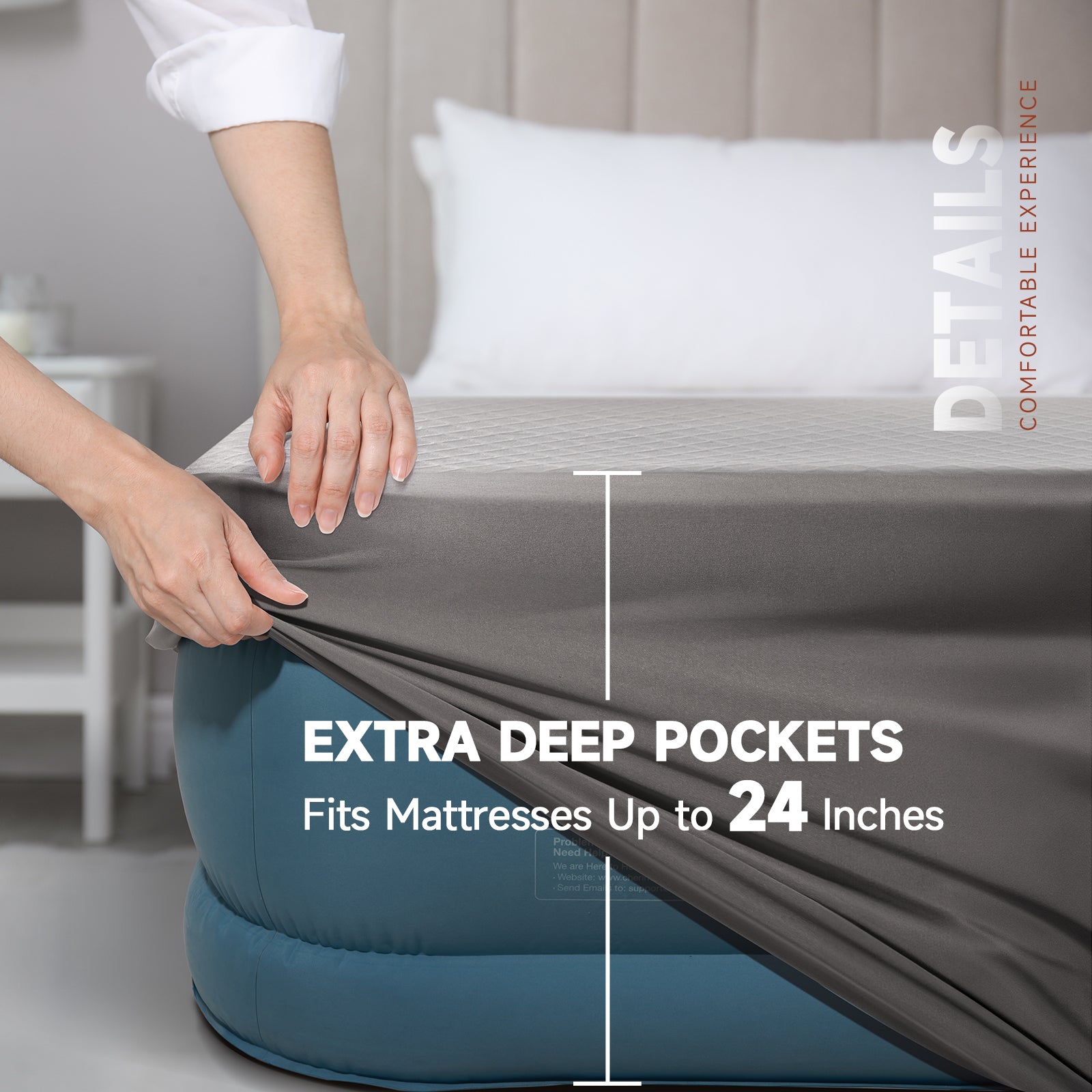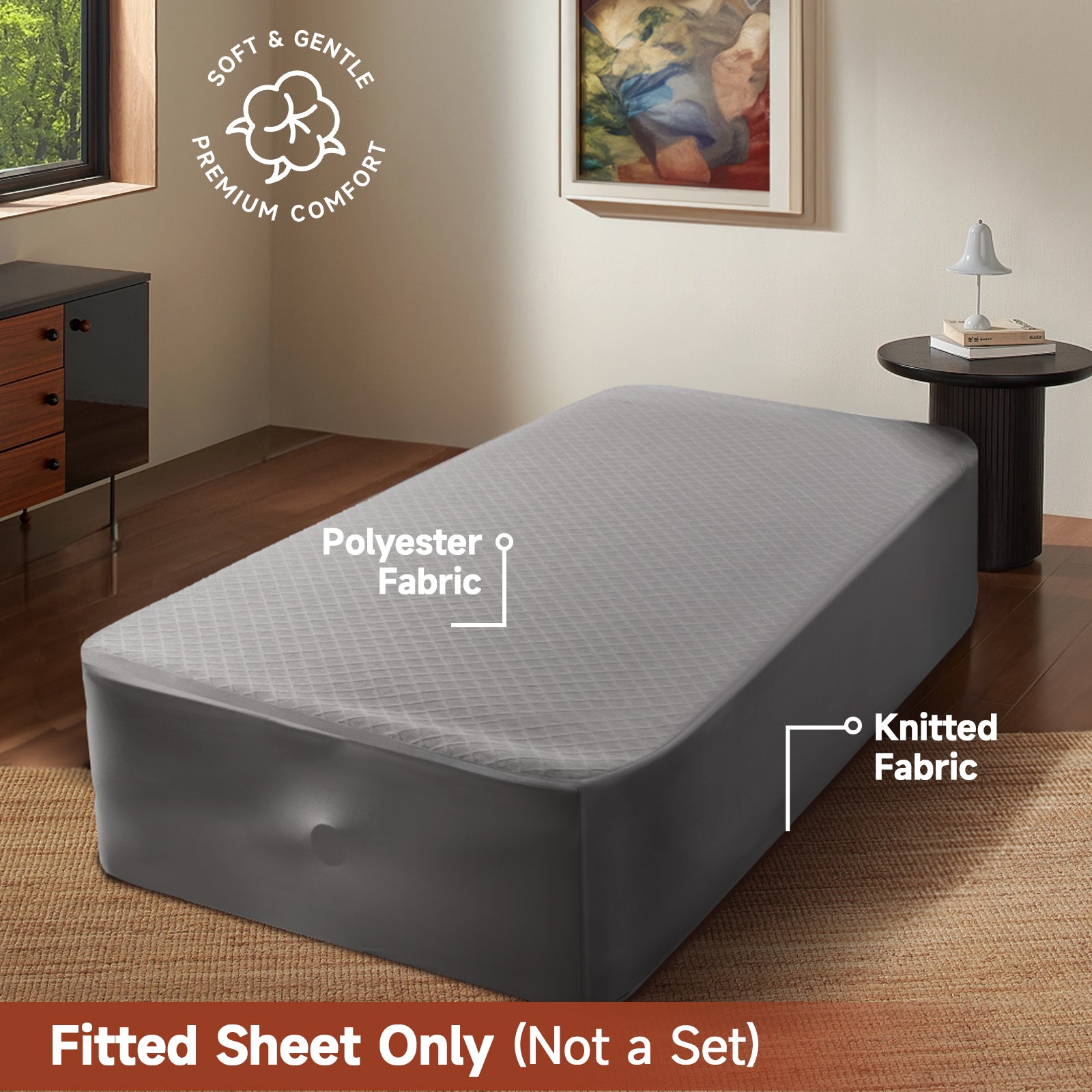 - Perfect Fit for All Types of Beds: Our fitted sheet measures 75 x 39 inches and accommodates depths of up to 24 inches. This ensures a perfect fit on various mattresses, from memory foam to pillow-top styles. Whether you’re refreshing your master bedroom, setting up an air mattress for guests, or creating a welcoming space for special occasions, this versatile fitted sheet is an ideal solution. The top is crafted from a sophisticated, breathable polyester fabric featuring a grey wave diamond quilted pattern, while the sides are made from soft knit fabric, adding a touch of elegance to your bedroom.