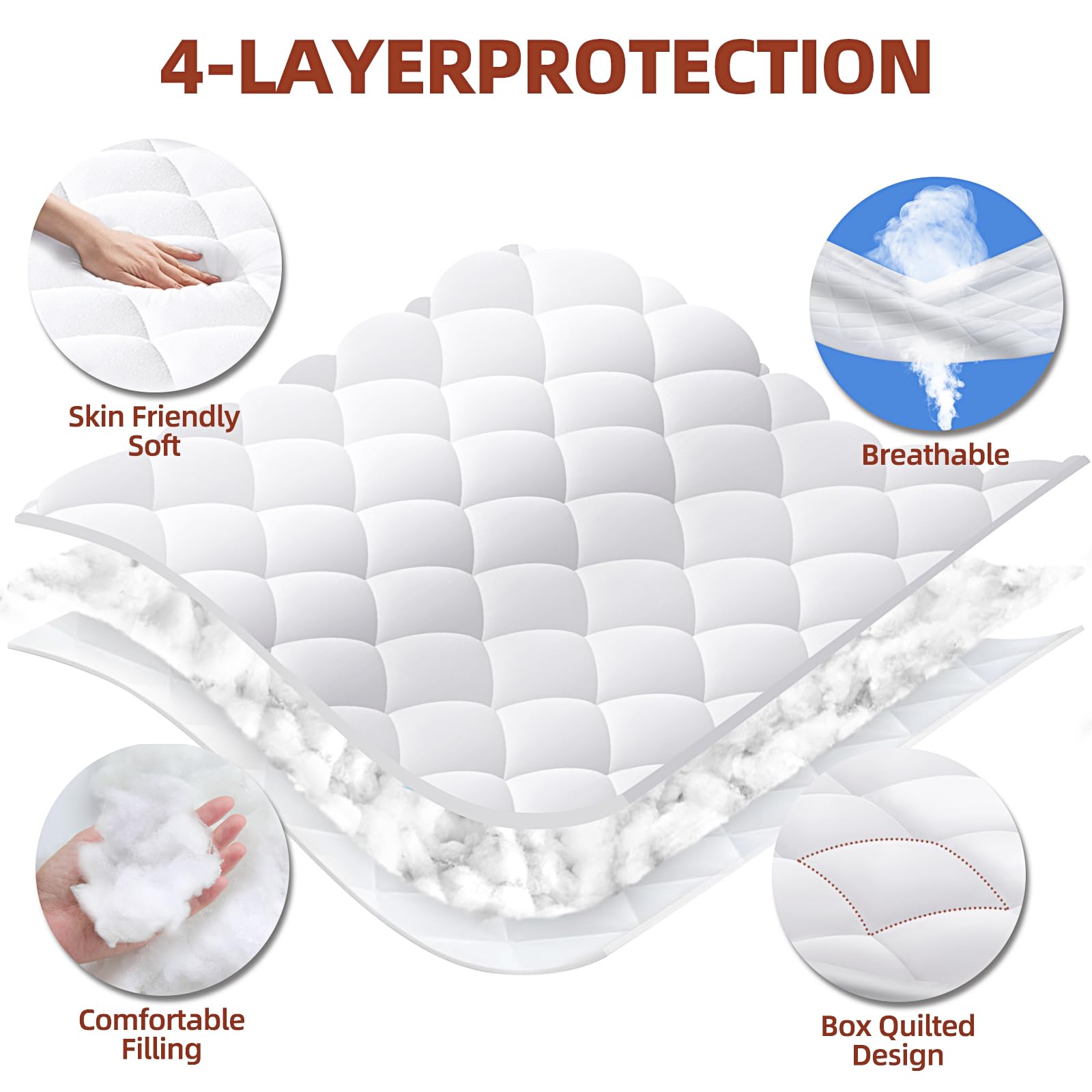 - Box Quilting Design: This design fixes the filling in a small grid of 10×10cm, avoiding the displacement and accumulation of the filling, bring you a stable and comfortable feeling. The tightly reinforced stitching greatly extends the life of the mattress cover. The regular and atmospheric box pattern symbolizes high-end quality of life.
