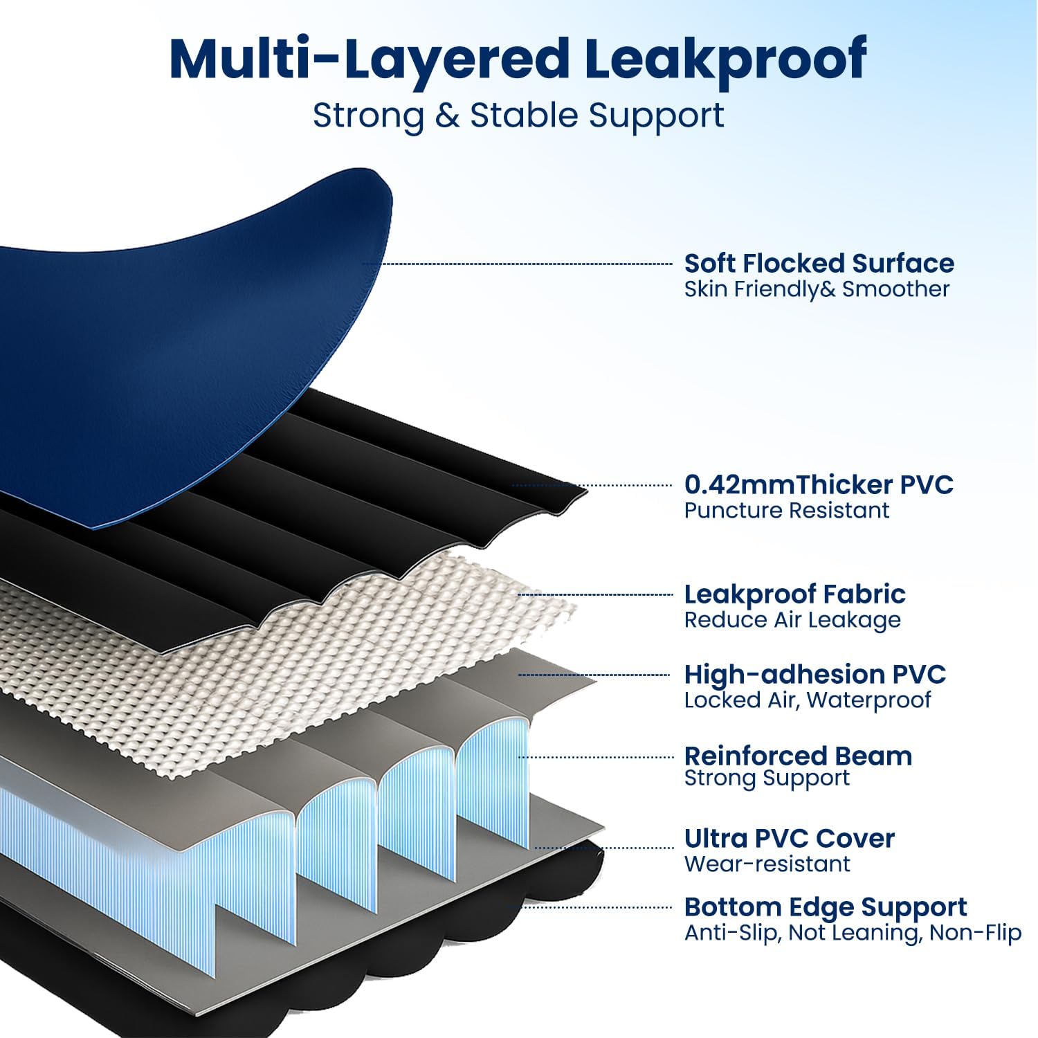 - Multi-Layer Leakproof Protection: Queen air mattress with built in pump is crafted with multi-layered 0.4mm thickened PVC that resists punctures, air leaks, and softening caused by PVC expansion. Reinforced seams and stable air chambers ensure every inch stays fully inflated, making airmattress queen size durable enough for frequent use and versatile setups