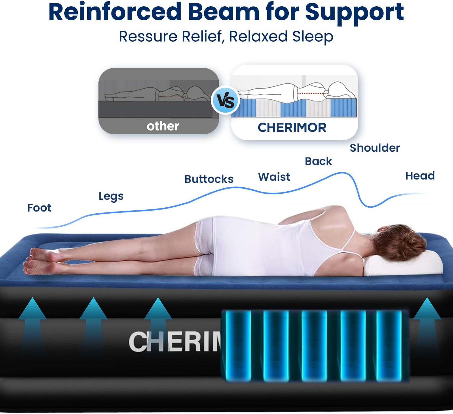 - Plush Flocked Surface for Deep and Relaxing Sleep: Air mattress queen with built in pump features a 0.42mm velvety flocked top that feels soft and skin-friendly, creating a calm surface for deeper sleep. Queen size air mattress made with puncture resistant PVC, it combines comfort with durability. The deep-blue fabric adds a premium look and hides dust or small marks better than light-colored mattresses