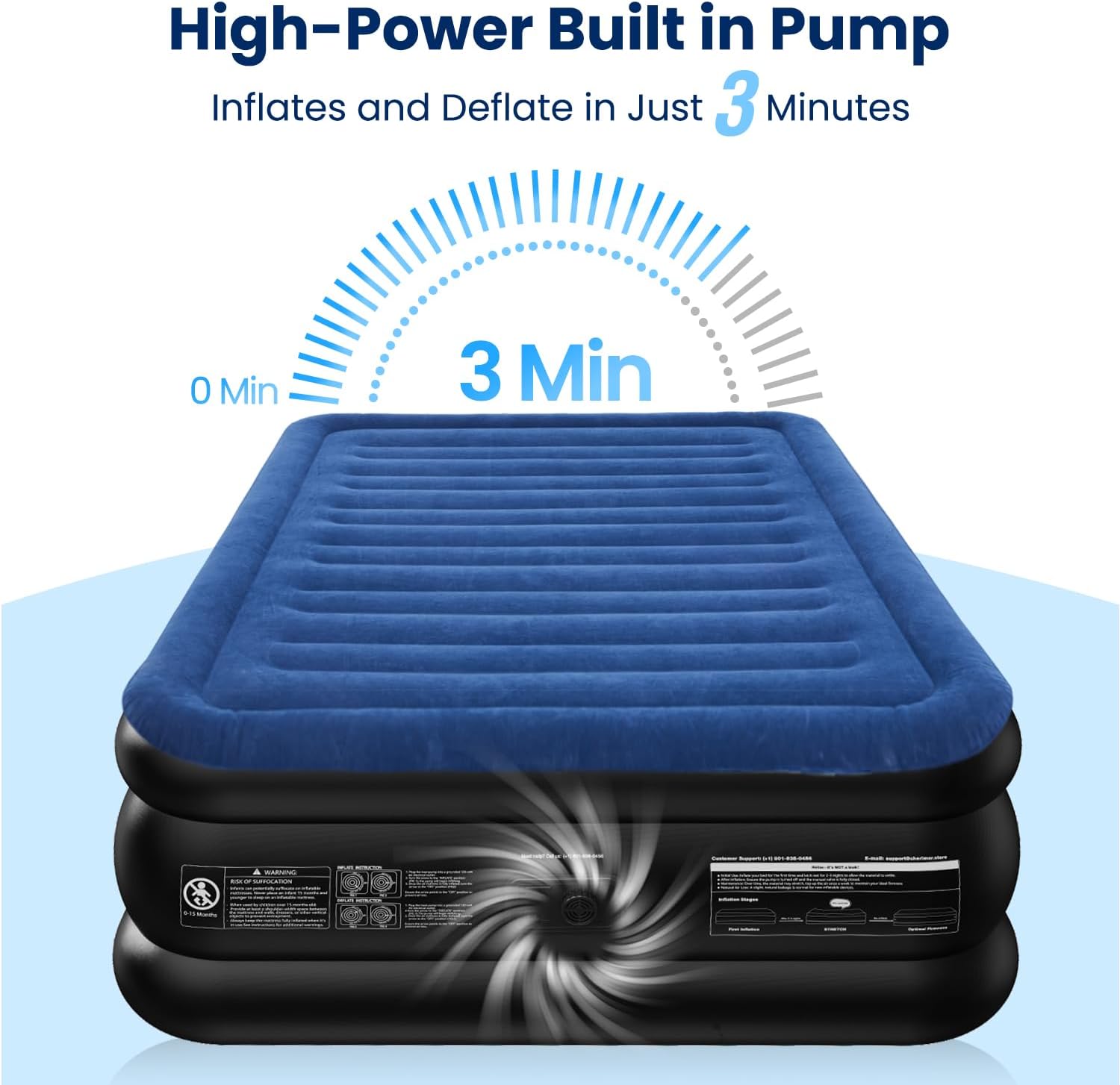 - Fast 3-Minute Inflation with Built-In Pump: Inflate or deflate the luxury air mattress queen with just one touch. The high-speed 120V pump fills the airmattress in under 3 minutes — faster than brushing your teeth.When you’re done, easily roll it up and store it in the included travel bag. Perfect for camping, travel, guests, or moving, this air bed is ready whenever you are