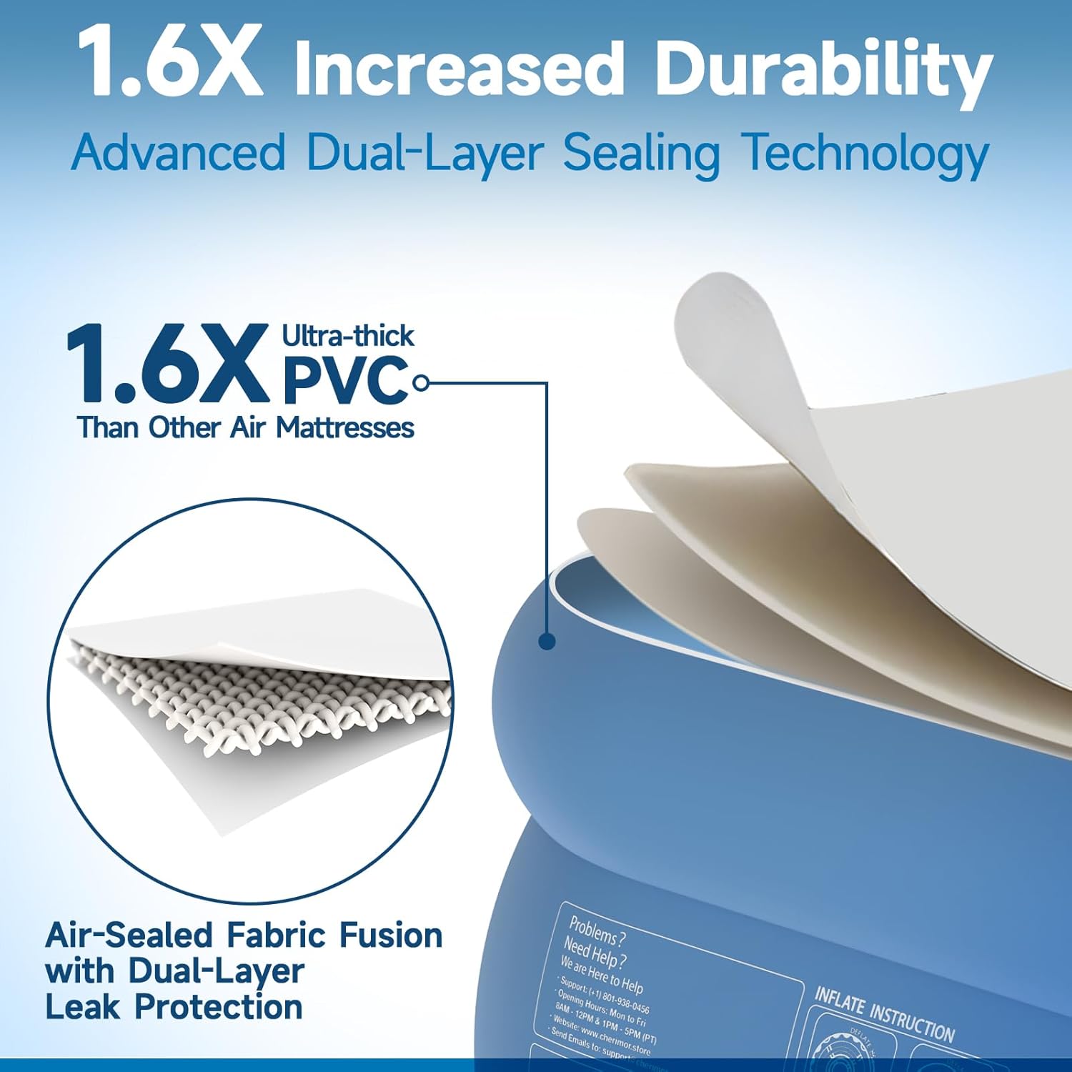 - Air Sealed Fabric Fusion 55% Increased Durability: Compared with other air mattresses, our inflatable mattress is made of 0.65 mm Advanced Dual-Layer Sealing Technology, which is 55% more durable and waterproof. In many environments, CHERIMOR has a longer life and is more cost-effective