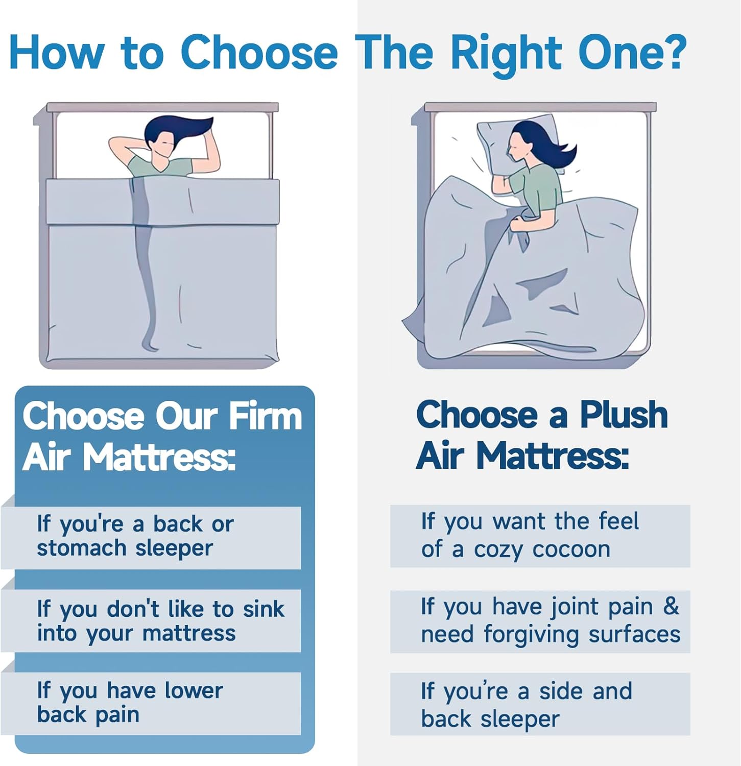 - 1500-Pound Support Upgraded Firm Air Mattress: This blow up mattress offers enhanced ergonomic support, ensuring full-body alignment and consistent weight distribution and provide friendly support for the spine. Air mattress paired with a quilted mattress pad for extra comfort, ensure that you can sleep peacefully and meet your various sleeping needs