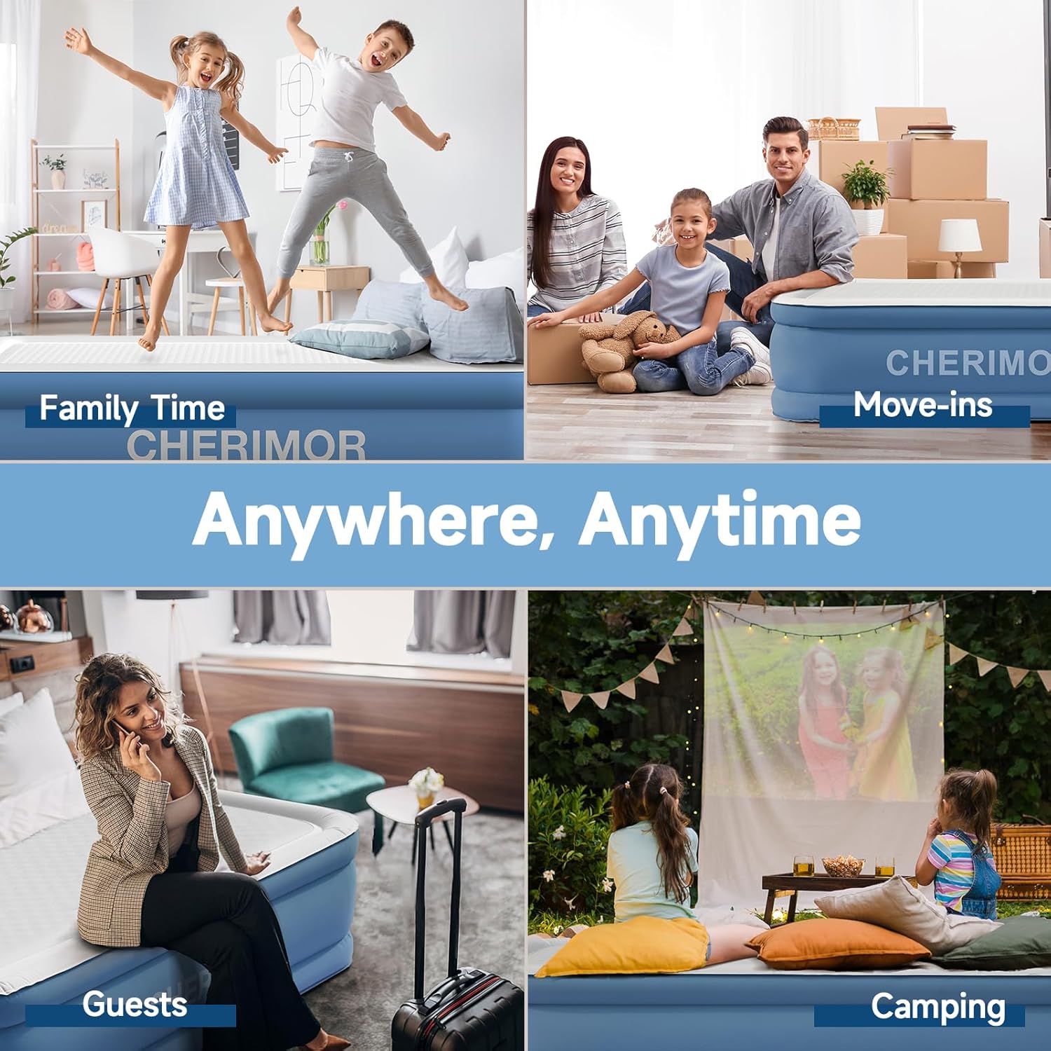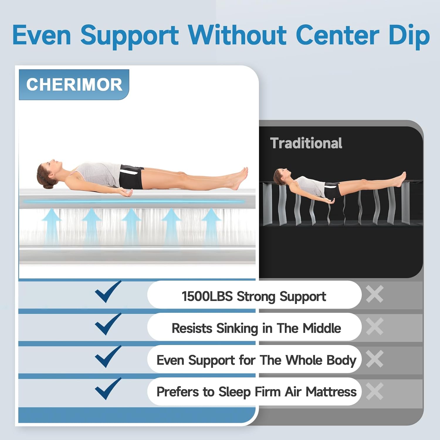 - Ultra Firm Fiber Structure Reduce Air Leakage Worries: CHERIMOR air mattress internal structure is made of millions of high-strength polyester fibers. This allows the air mattress to maintain its shape for a long time without frequent air additions, allowing for more long-lasting, deep and unwind your sleep experience